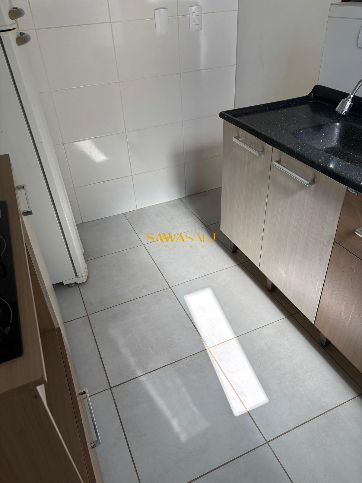 - Cozinha com pia, armários, cooktop e geladeira